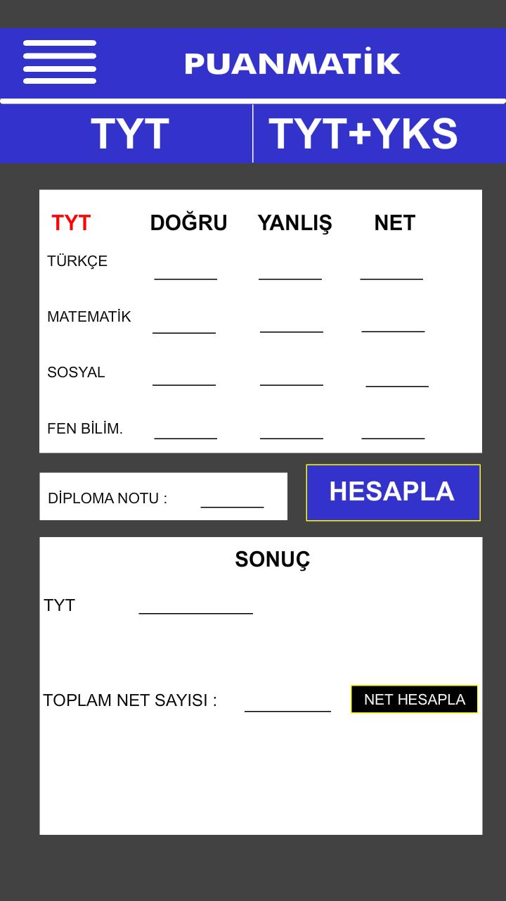Yks puan hesaplama robotumuz ile temel yeterlilik testi tyt puan hesaplama, alan yeterlilik testi ayt puan hesaplama, yks puan hesaplama ve ydt yks dil puanı hesaplama işlemlerinizi tek sayfa üzerinden yapabilirsiniz. Bu iki oturumdan oluşan sınavın ismi yks (yüksek öğretim kurumları sınavı) olarak belirlenmiştir. Yks puan hesaplama yapabilmek için öğrencilerin ilk olarak kısa adı tyt (temel yeterlilik testi) olan oturuma ve ardından kısa adı ayt (alan yeterlilik testi) olan oturuma girmeleri gerekmektedir. Yks puan hesaplama 2021 ösym yks puan hesaplamaları için hazırlanmıştır. 2021 tyt puan hesaplama, 2021 ayt puan hesaplama, 2021 yks puan hesaplama,2021 yks siralama hesaplama,2021 tyt siralama hesaplama, 2021 türki̇ye siralamasi hesaplama, ösym puan hesaplama, yök